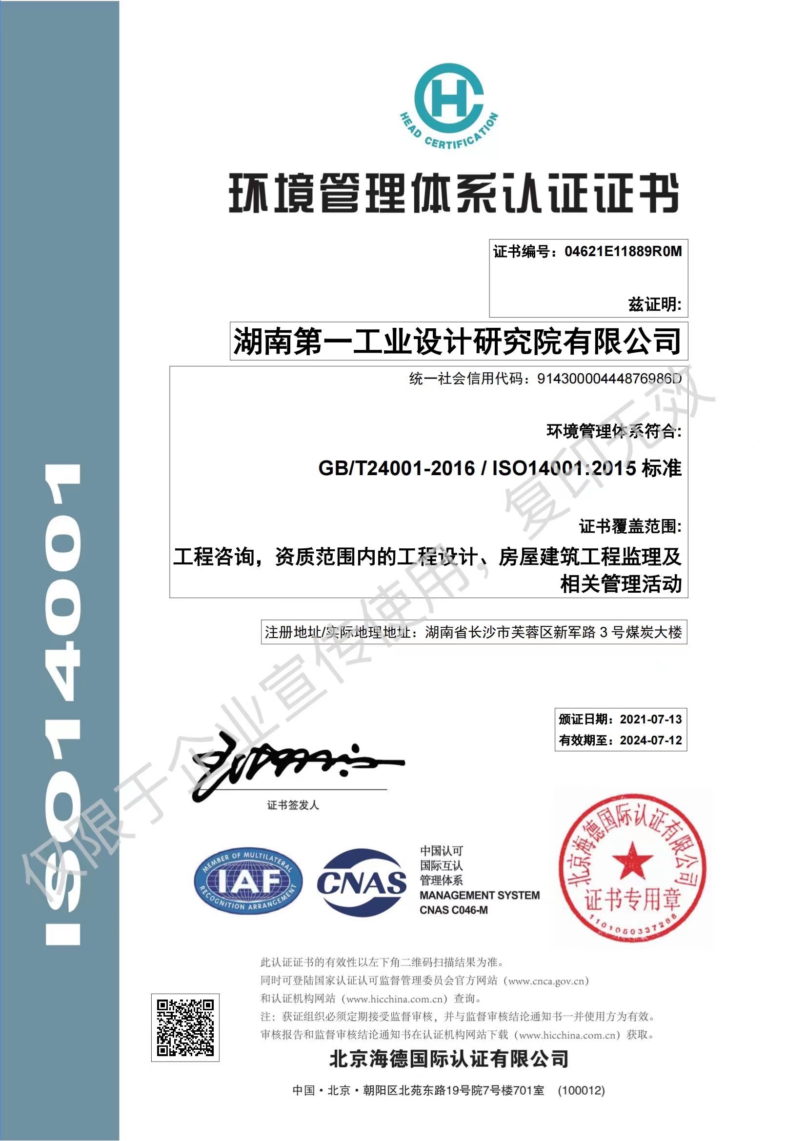 ISO14001環(huán)境管理體系認證證書